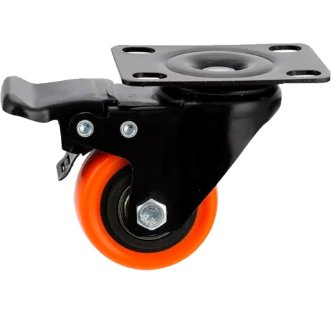 Rodizio Giratório com Placa e Freio, rodas de PVC na cor laranja, diâmetro da roda 2 polegadas, produto de alto desempenho, projetado para uma carga robusta de até 50kgf.